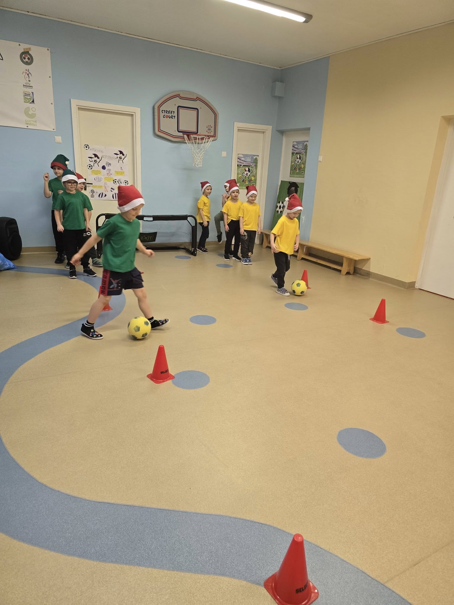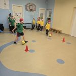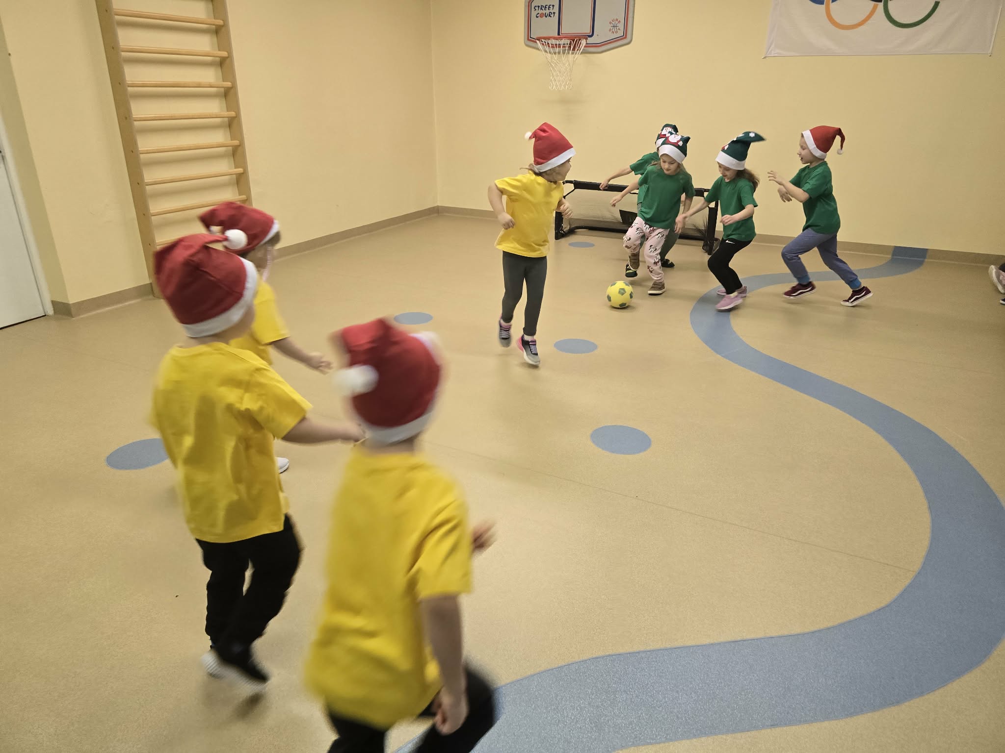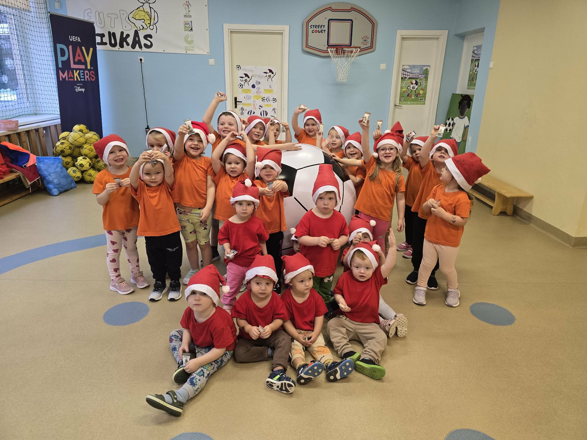 „Futboliuko Kalėdų“ tema džiugino vaikus ir per kūno kultūros valandėles. Jų metu darželinukai varžėsi „Įvarčių rungtynėse“ ir estafetėse ,,Varyk greičiau“, žaidė žaidimą ,,Užauk“, futboliuką 3×3.